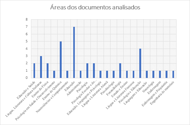 Por outro lado, verificamos, ainda, pesquisa na área de Psicologia, Fonoaudiologia, Enfermagem, Neurologia, Neurociências e Comportamento, Administração, Língua e Literatura Alemã, Psicobiologia, Língua e Literatura Francesa, Enfermagem e Psiquiatria, Engenharia de Materiais, Língua, Literatura e Cultura Italianas, Psicologia em Saúde e Desenvolvimento, perfazendo um total de 40% das produções analisadas. Assim sendo, é desvelada a diversidade de áreas que se servem desse conceito, ainda que limitado no estudo pelo filtro que favorece os processos educacionais.